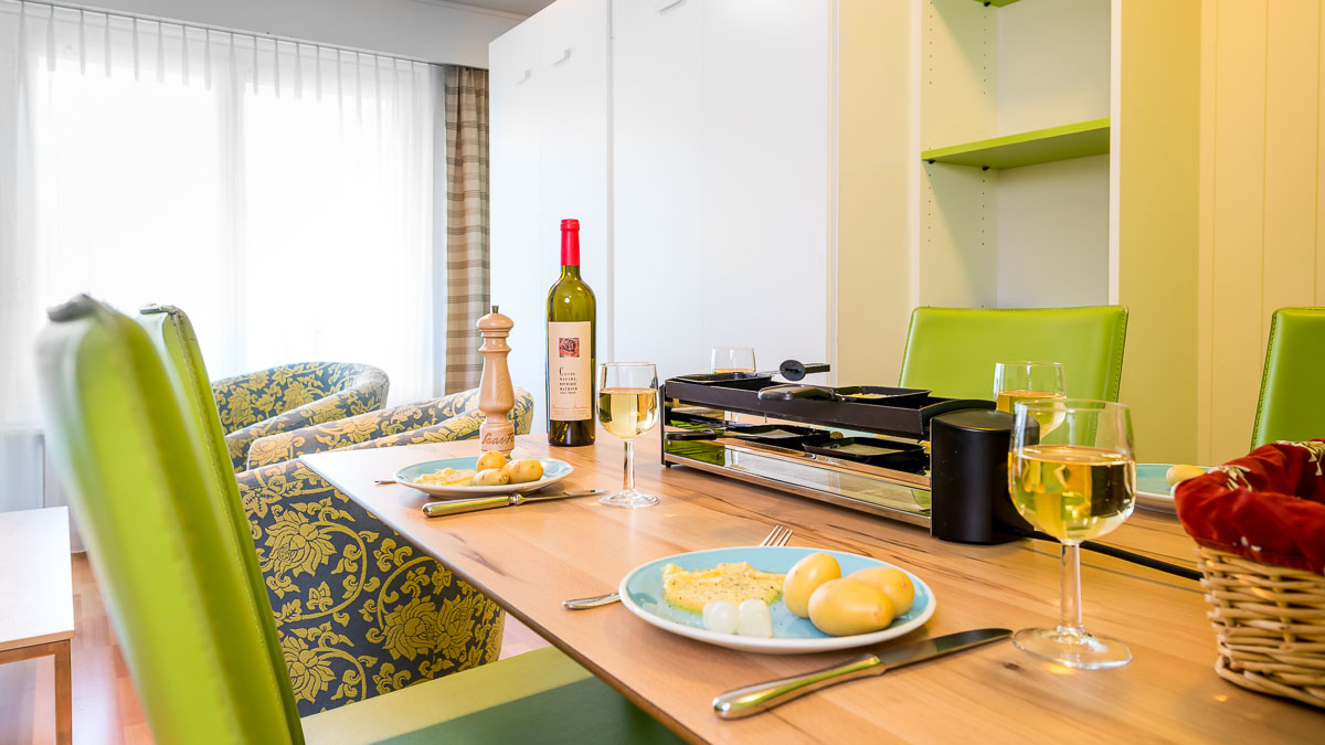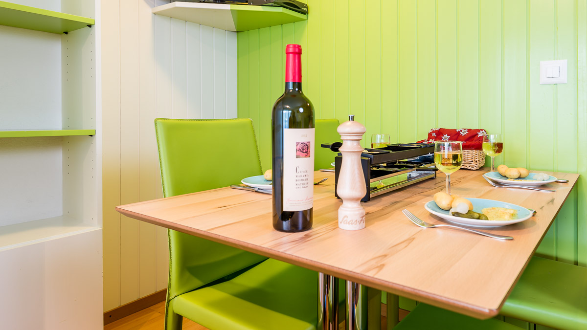 Die geräumige 2.5-Zimmerwohnung bietet alles, um erholsame Ferien zu verbringen. Es ist mit dem Wichtigsten ausgestattet, praktisch und gleichzeitg gemütlich. Die Ausstattung ist qualitativ hochwertig und modern. Wie bei allen Ferienwohnungen sind die Möbel Schweizer Qualität. In allen Häusern stehen unseren Gästen Waschmaschine, Bügelbrett und Bügeleisen zur Verfügung. Das Internet können Sie kostenfrei nutzen. Damit Sie Ihren Urlaub von Anfang an geniessen können, sind die Betten bereits bei Ankunft bezogen. Frottéwäsche und Küchentücher sind inbegriffen.