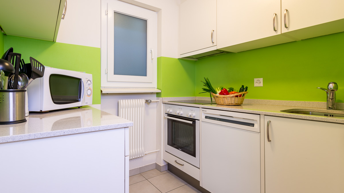 Die neue Küche ist vollwertig eingerichtet und besteht aus modernen Geräten wie Ceranfeld und Backofen.