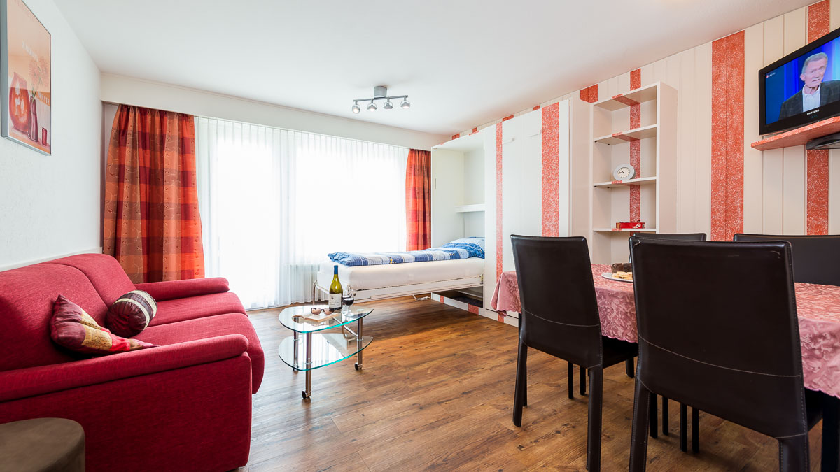 Die 2.5-Zimmerwohnung verfügt im Wohnraum über zwei Schrankbetten und ein separates Schlafzimmer. Alle Betten bestehen aus Schweizer Qualitätsmatratzen (Bico)