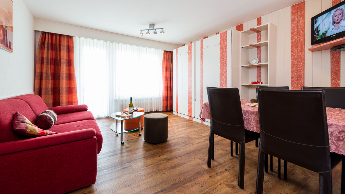 Die gemütliche Wohnung Superior besteht aus einem grosszügigen Wohn-Schlafraum, der alles bietet, um erholsame Ferien zu verbringen. Ein grosses Panoramafenster macht den farbigen Wohnraum hell und freundlich. Vom Wohnraum aus betritt man den möblierten Balkon.