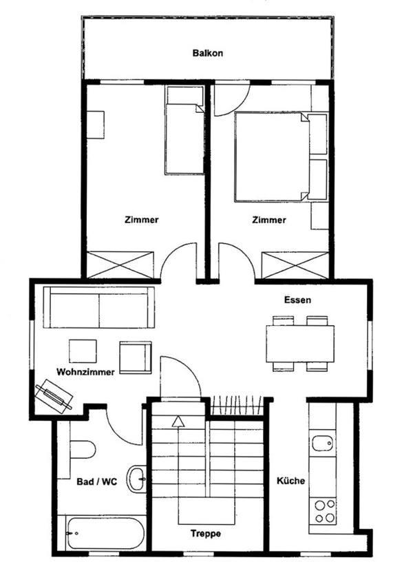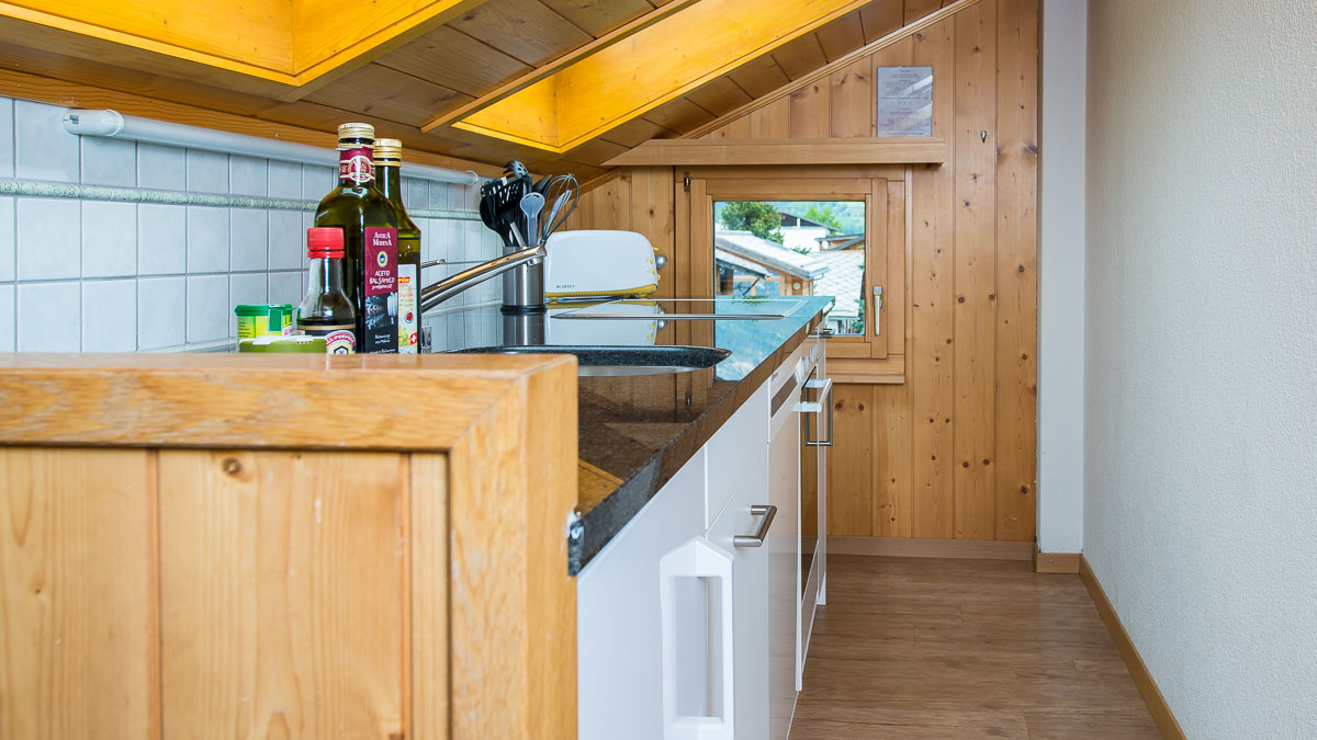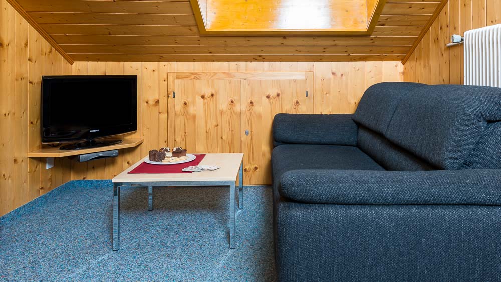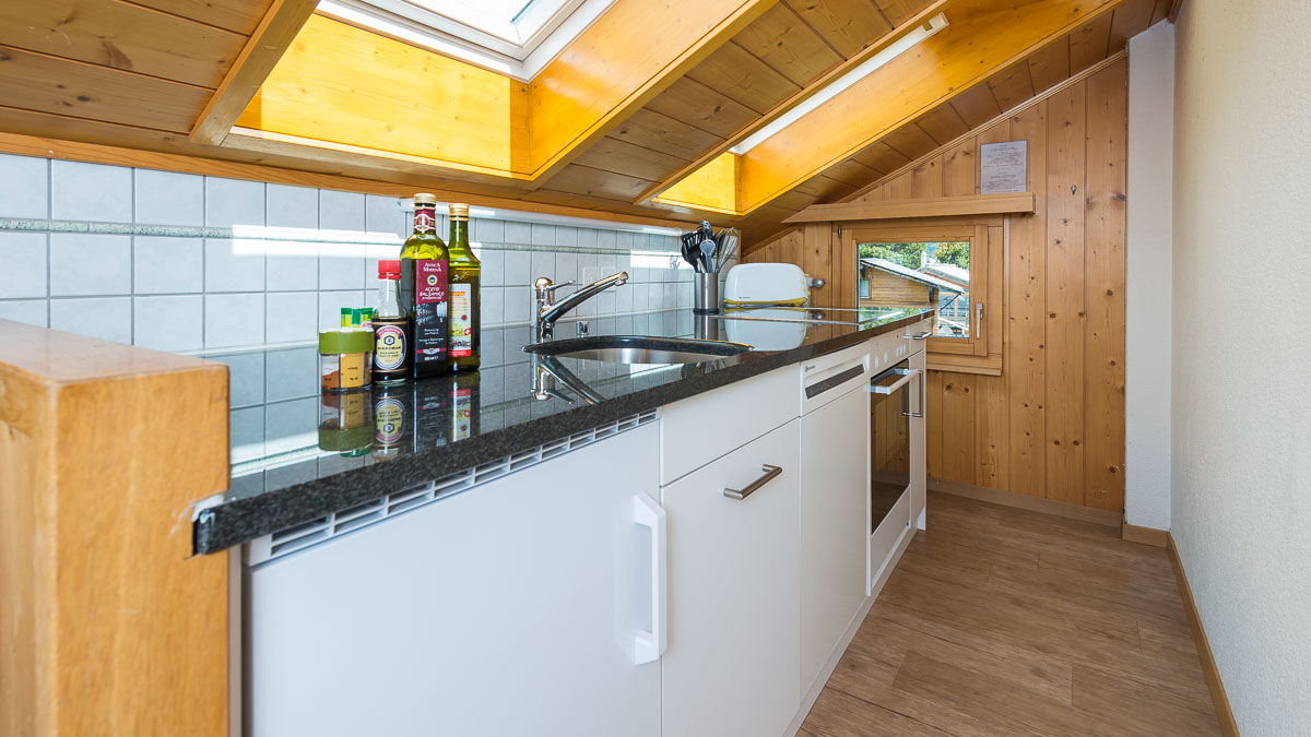 Die rustikale Dachwohnung besteht aus einem Wohnzimmer, einem gemütlichen Essbereich mit angrenzender Küche. Ein Schlafzimmer besteht aus 2 Betten nebeneinander, im zweiten Schlafzimmer hat es ein Etagenbett mit zwei Einzelbetten übereinander für total 2 Erwachsene und 2 Kinder. Durch die Dachfenster fällt viel Licht in die Wohnung mit abgeschrägten Decken und macht diese hell und freundlich. Vom grösseren Schlafzimmer aus betritt man den möbilierten Balkon.