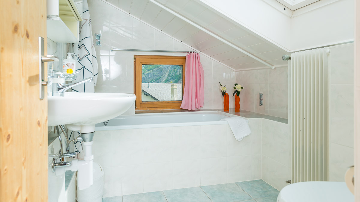 Das moderne Wannenbad ist vollgefliest und verfügt über ein leicht zu öffnendes Panoramadachfenster.